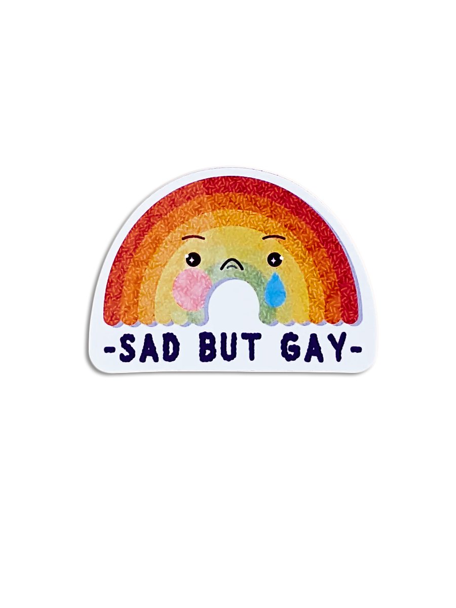 The Sad But Gay Sticker makes your belongings look even more adorable: your laptop, sketchbook, or your planner. It is perfect for kawaii gay peeps! These stickers are printed on quality matte weatherproof vinyl, so you don't have to worry about ruining them!